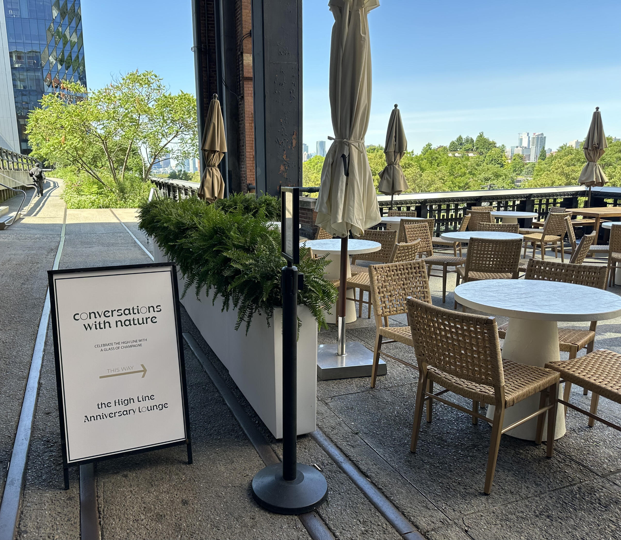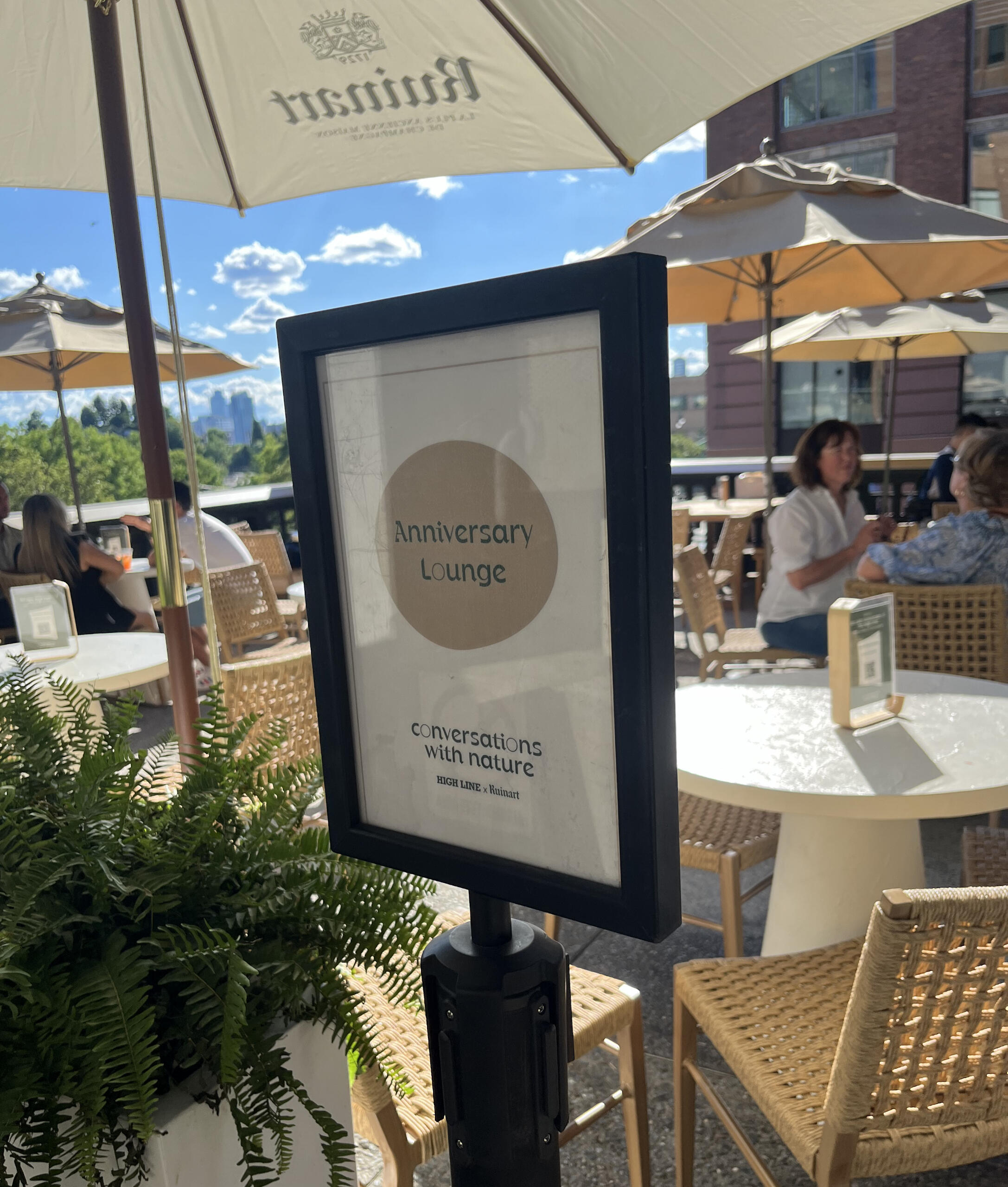 In celebration of 15 years since the opening of the High Line’s first section in 2009, we partnered with Ruinart and Friends of the High Line to create a unique and elegant experience that brought extra sparkle to this milestone. From late June through mid-July, we transformed a portion of Chelsea Market Passage at 15th Street into the Conversations with Nature: High Line Anniversary Lounge. This chic lounge invited visitors to relax, soak in the park’s beauty, and celebrate with a glass of Ruinart champagne. More than just a lounge, the space offered an immersive, educational experience highlighting the shared dedication of Ruinart and the High Line to biodiversity and sustainability.